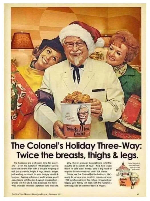 OMG is this ad copy real? Somehow I donât think all those double entendres would have gotten past the censors back in ⊠whenever this was. The Harland Sanders character was created in 1935 and the first KFC opened in the early 50s â this does look like maybe the 50s or at best the early 60s.