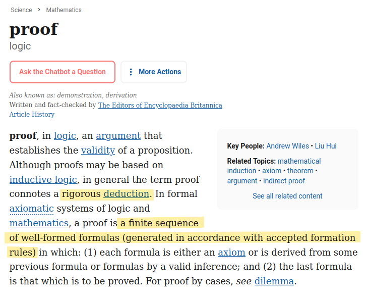 Here is an explanation of the word proof, in the context of a mathematical/logical proof: